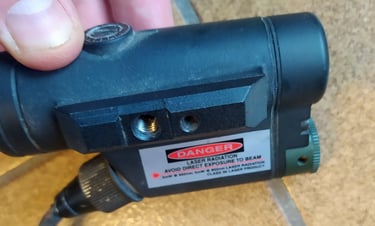 Alors qu'ici, le support picatinny a 1 seul levier de serrage. Le logo indique que c'est un support #17 de chez A.R.M.S. Inc. (c'est celui que l'on retrouvera dans l'Armée Française). Il est en 2 parties: l'A.R.M.S. #17 est un support type lampe surefire M93 sur lequel on visse un support avec un rail type Trijicon ACOG à un seul trou sur lequel on installe le laser.