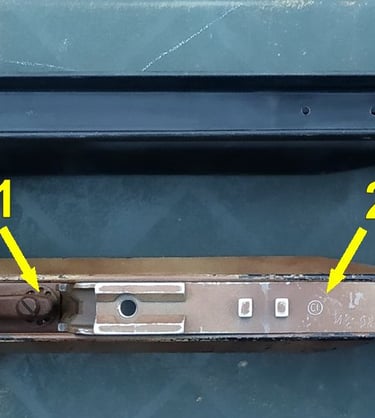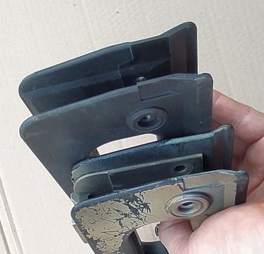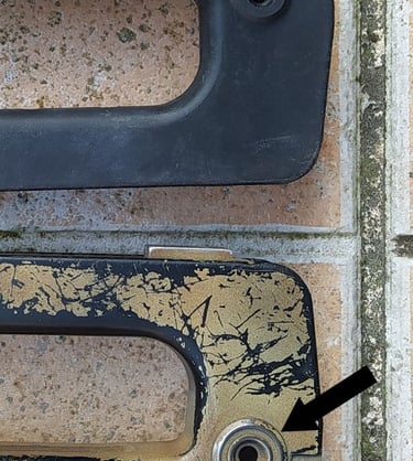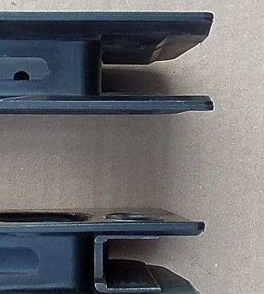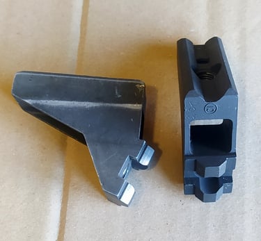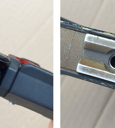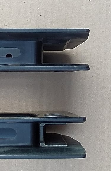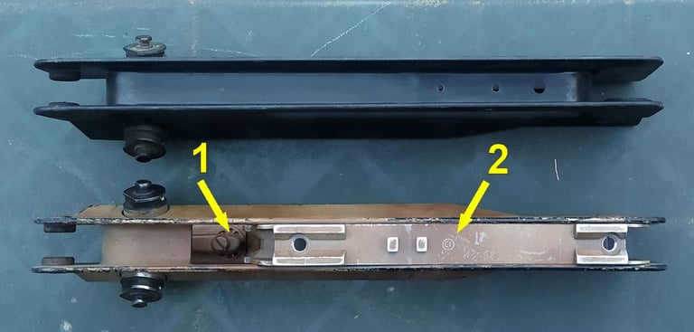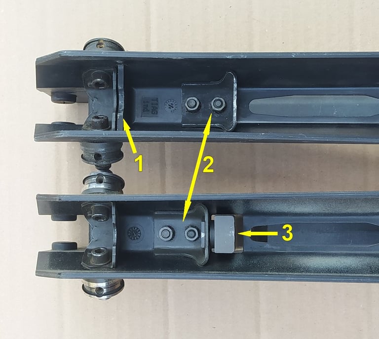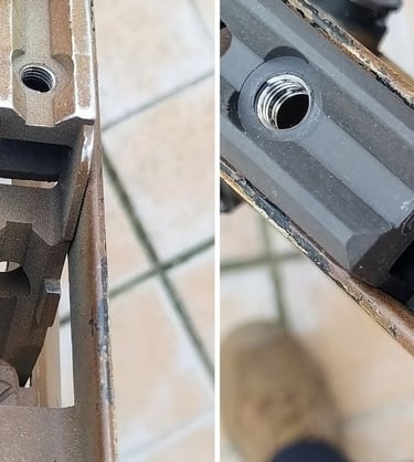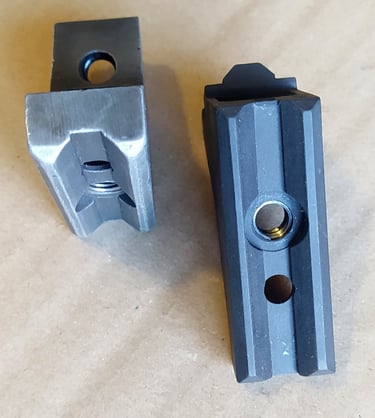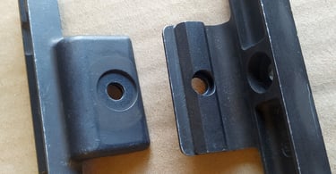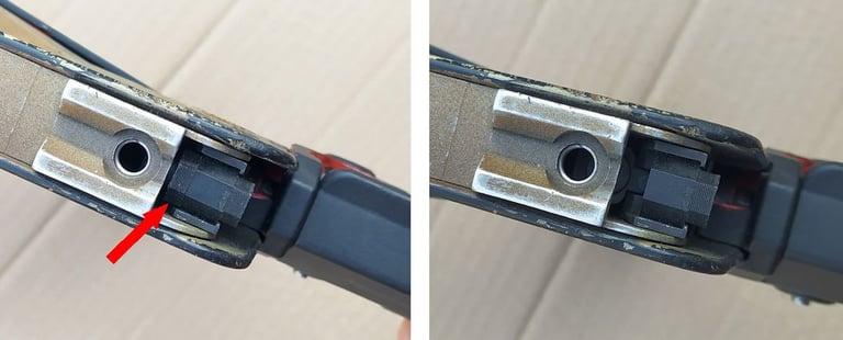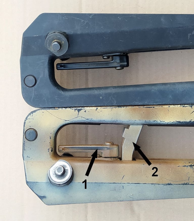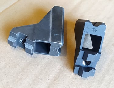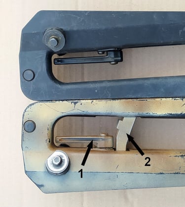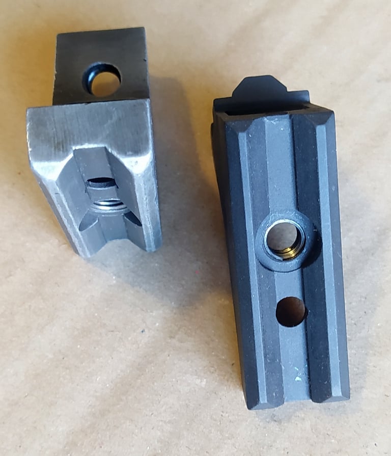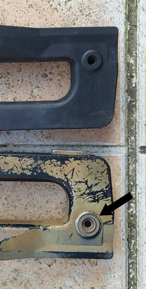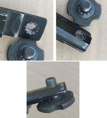 Comparatif Etrier de PGM sur PGM F1 à gauche et corps métallique de PGMP à droite. On comprend bien qu'une simple épaisseur de tôle percée (étrier de F1) a bien plus de jeu avec l'écrou de tige-guide que la bague sertie du corps métallique de PGMP.