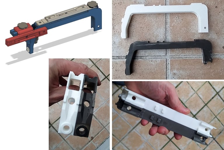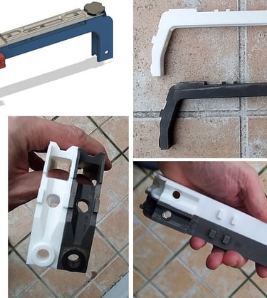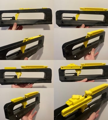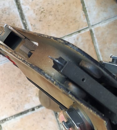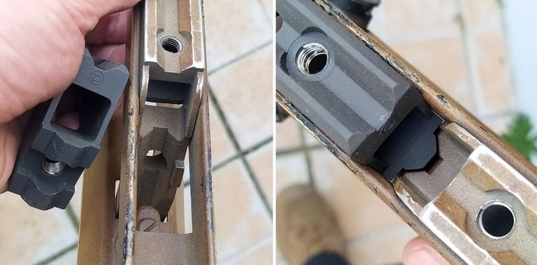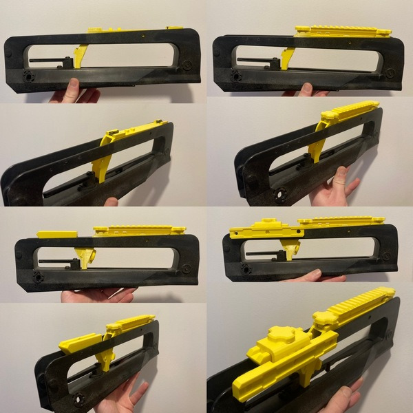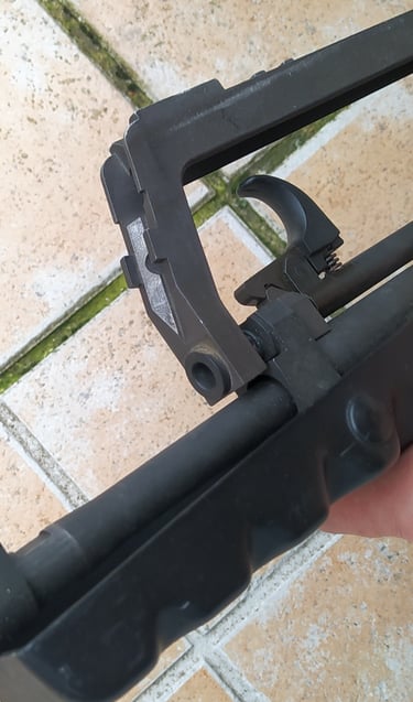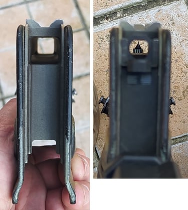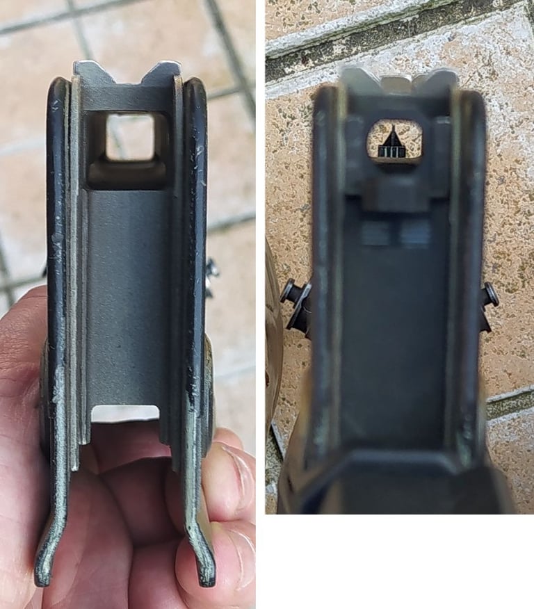 La partie qui englobera la tourelle porte-œilletons n'est plus une zone en plastique renforcée mais la partie métallique tourjours. Et il y a beaucoup moins de jeu pour glisser la PGM sur le Famas.