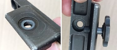 Les 2 rails possèdent des petits filetages au début du trou de passage de la mollette et la mollette a une partie lisse sur les 3/4 de sa longueur. Il faut alors visser légèrement la mollette dans le rail pour la faire rentrer dans le rail pour qu'ainsi elle reste bloquée dedans.