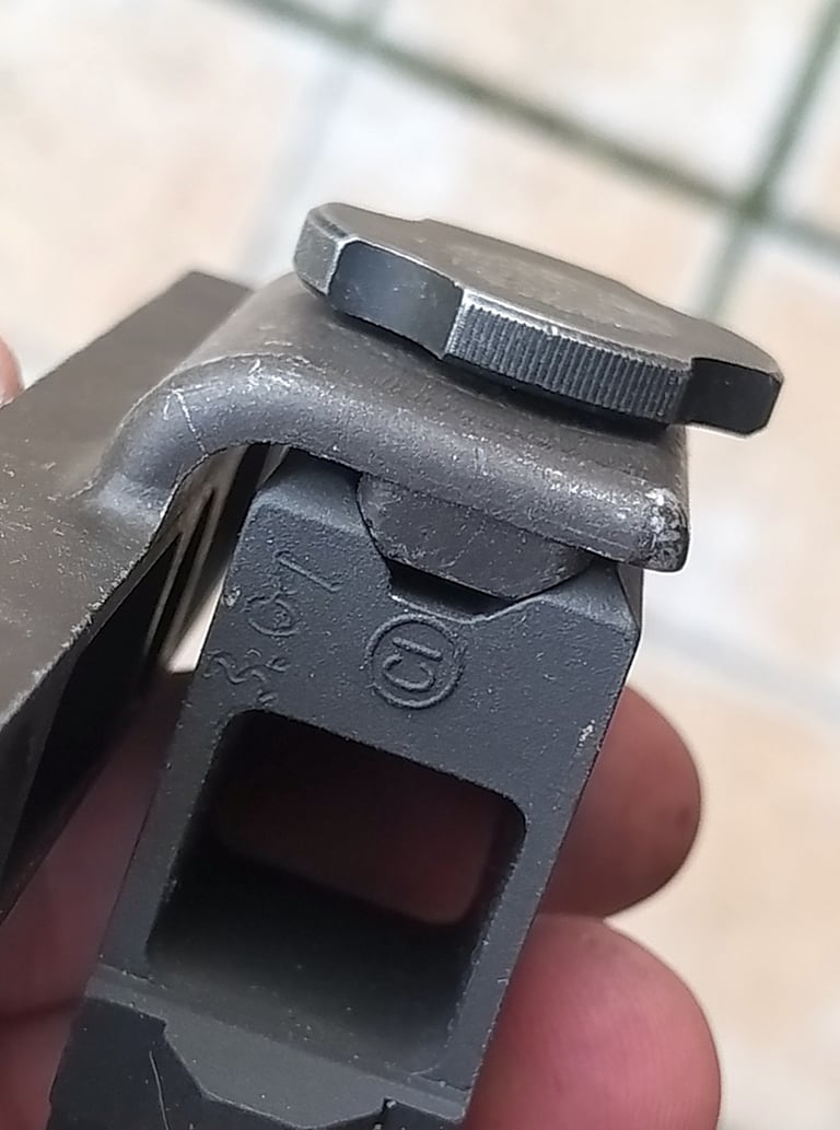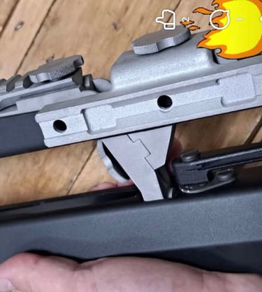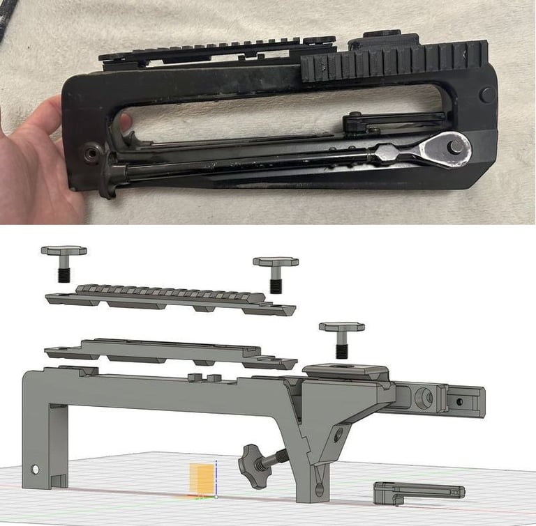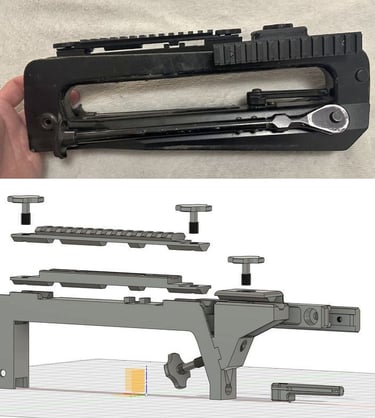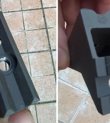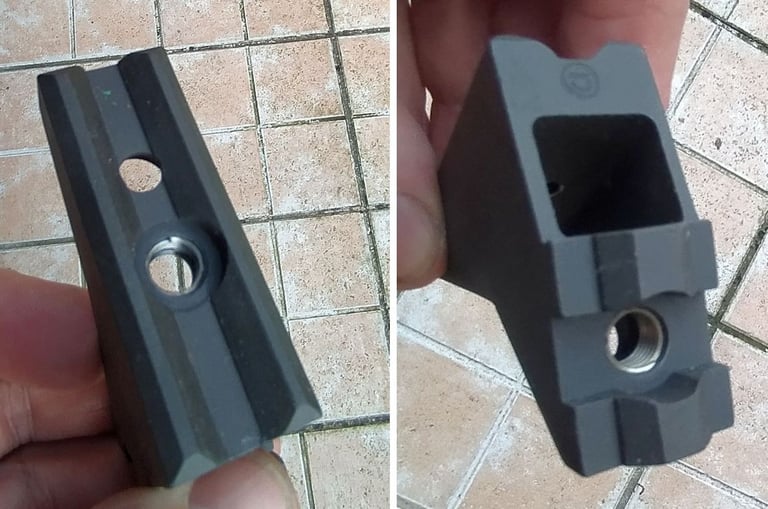 Le haut de la pièce est un rail otan d'optique de type Trijicon ACOG. On peut donc fixer une optique dessus. C'est pour ça qu'il y a un trou pour visser par-dessous juste devant le trou fileté qui sert à fixer le rail latéral.