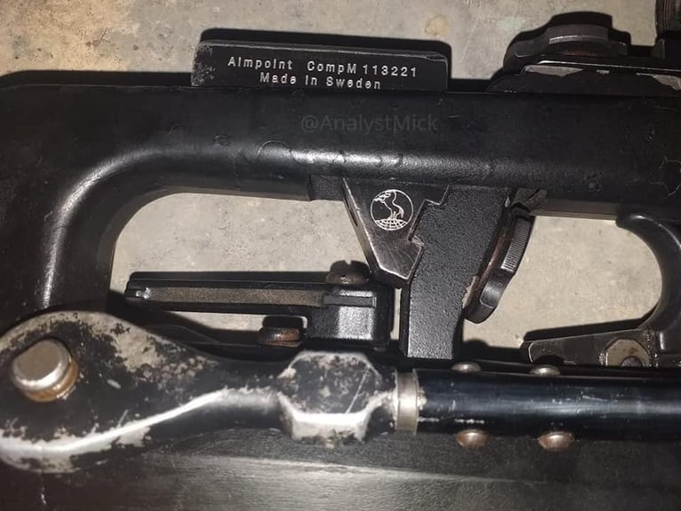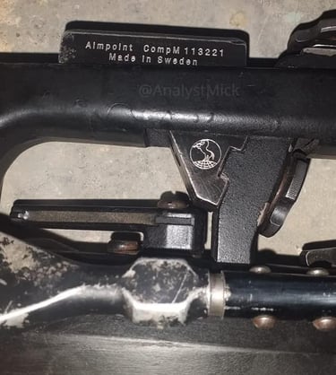 Marquages Aimpoint (Aimpoint n'ajoute pas "made in sweden" sur ces produits à ma connaissance) et logo COLT en dessous... bref surement des marquages fantaisistes.