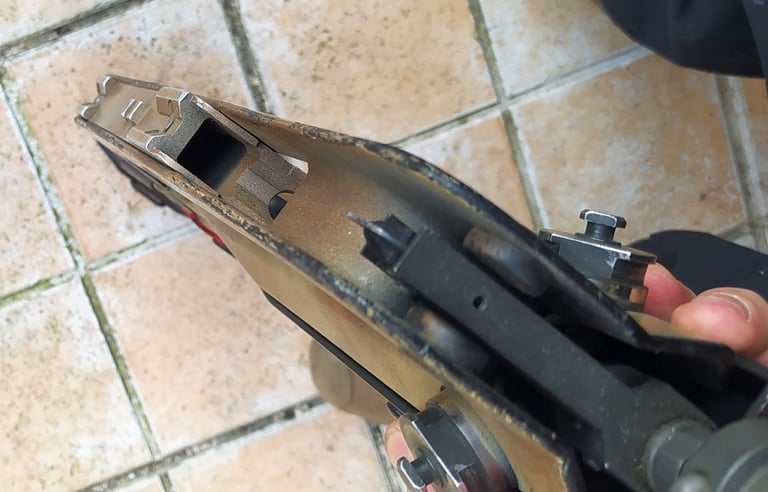 C'est ce corps métallique qui s'emboite sur l'avant dans l'écrou de tige-guide (via une bague sertie). L'ensemble concède bien moins de jeu à la PGM que l'étrier de PGM.